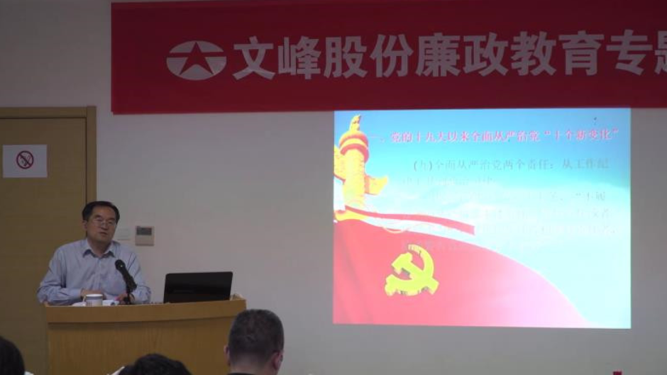 ? 5月16日,文峰股份特邀南通市紀(jì)委常委湯明文在文峰商學(xué)院開展廉政教育專題講座。公司總經(jīng)理室全體成員及相關(guān)部門負(fù)責(zé)人、各分公司總經(jīng)理助理以上高管人員參加了會(huì)議。