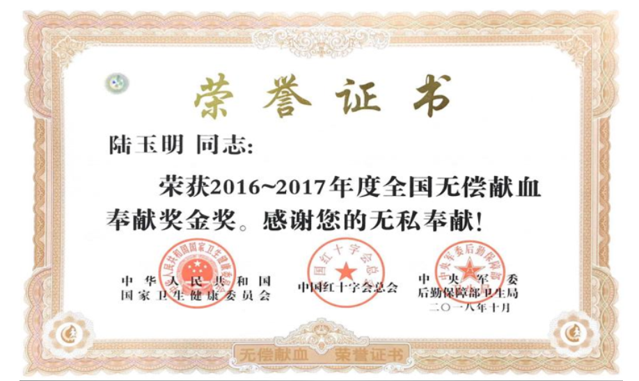 近日,文峰股份保安部員工陸玉明收到中華人民共和國國家衛(wèi)生建康委員會(huì)、中國紅十字會(huì)總會(huì)、中央軍委后勤保障部衛(wèi)生局聯(lián)合頒發(fā)的榮譽(yù)證書和20克足金金牌一枚。