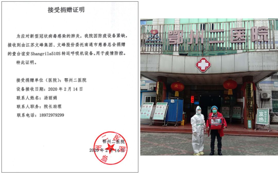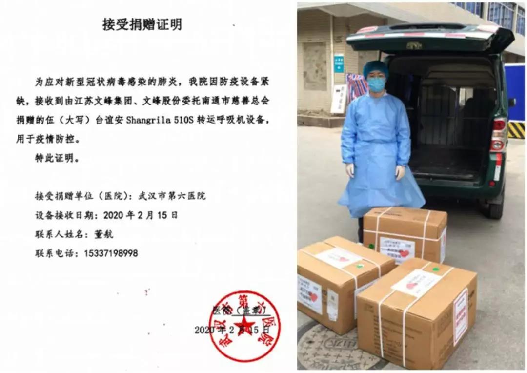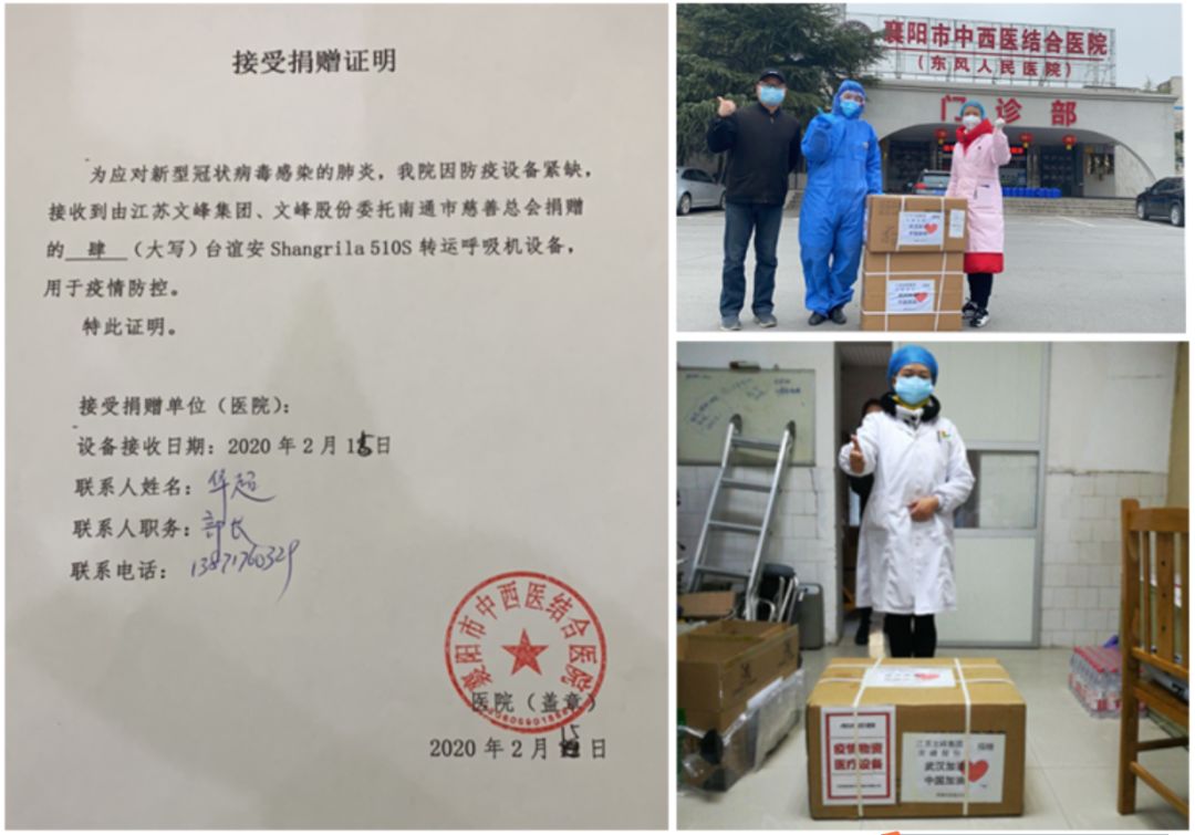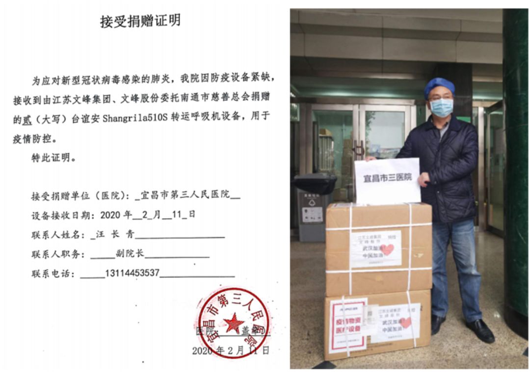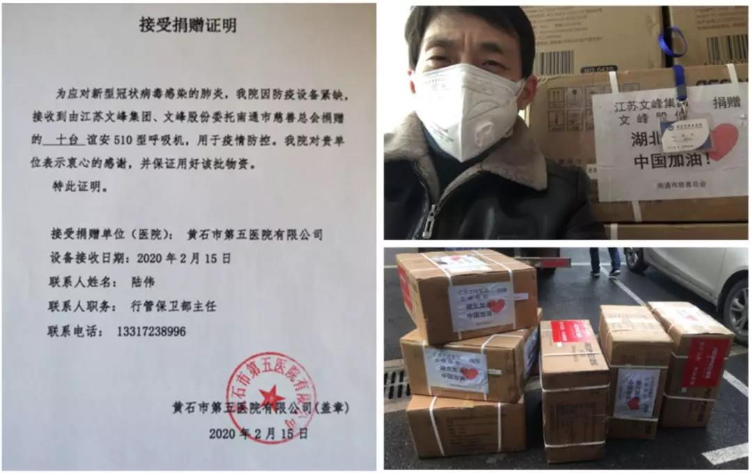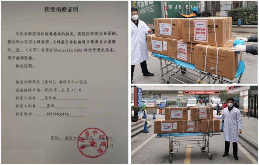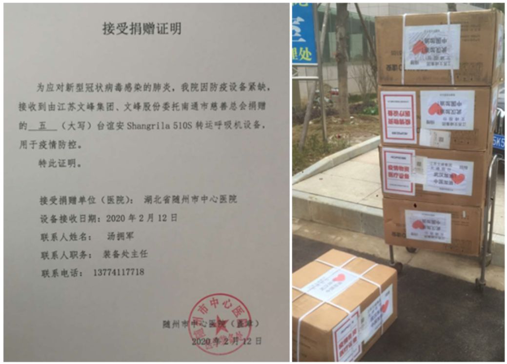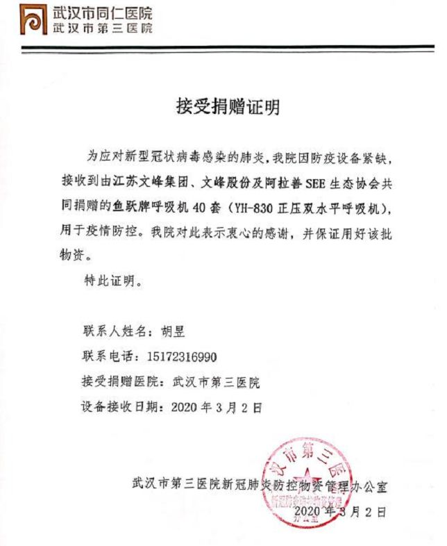 文峰集團攜手阿拉善SEE生態協會,共同捐助給武漢市第三醫院魚躍牌雙水平醫用專業呼吸機40臺,用于支援火神山醫院建設。