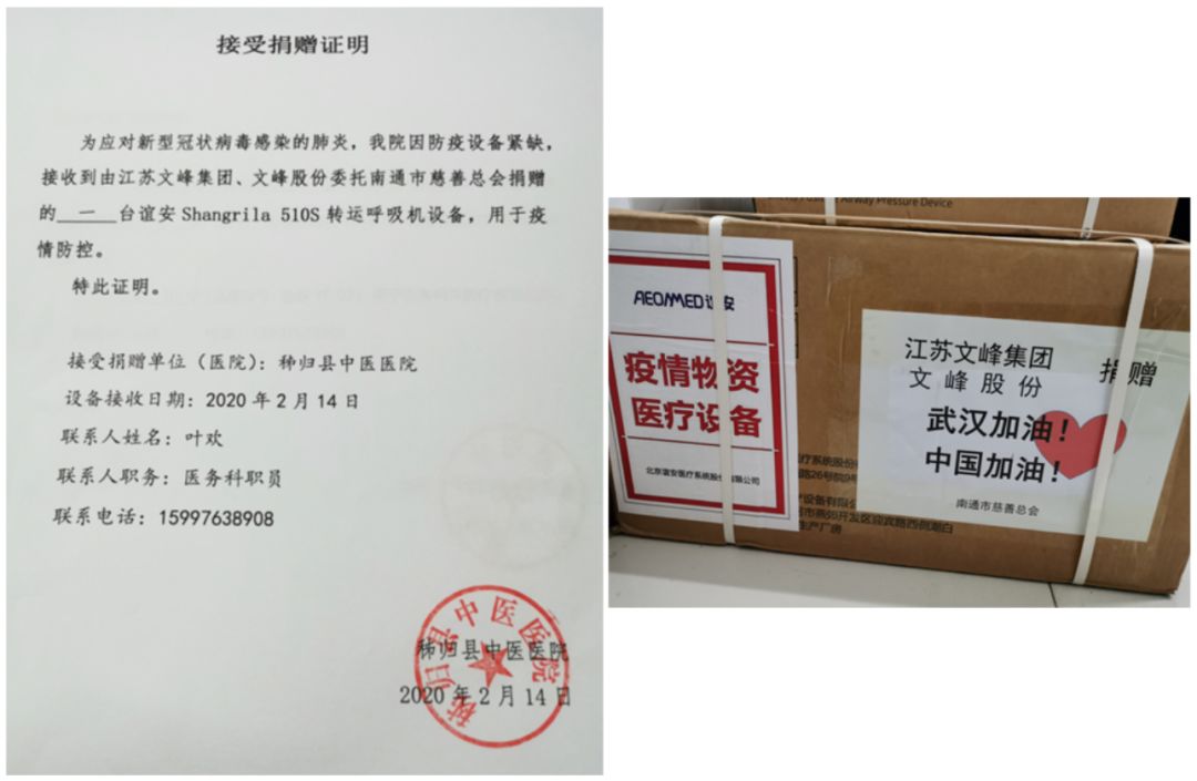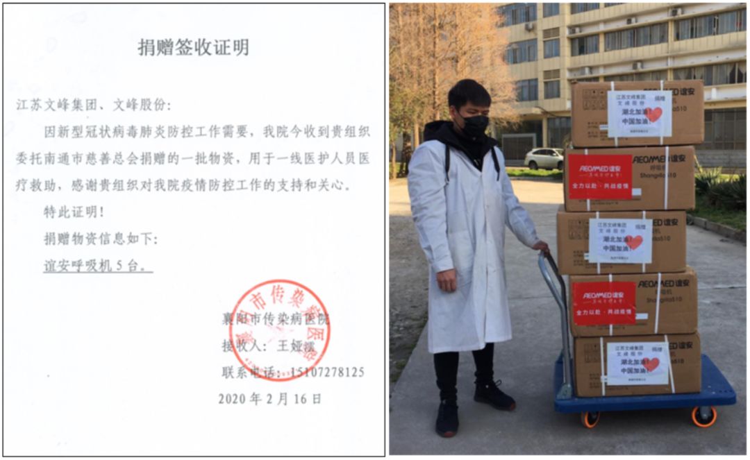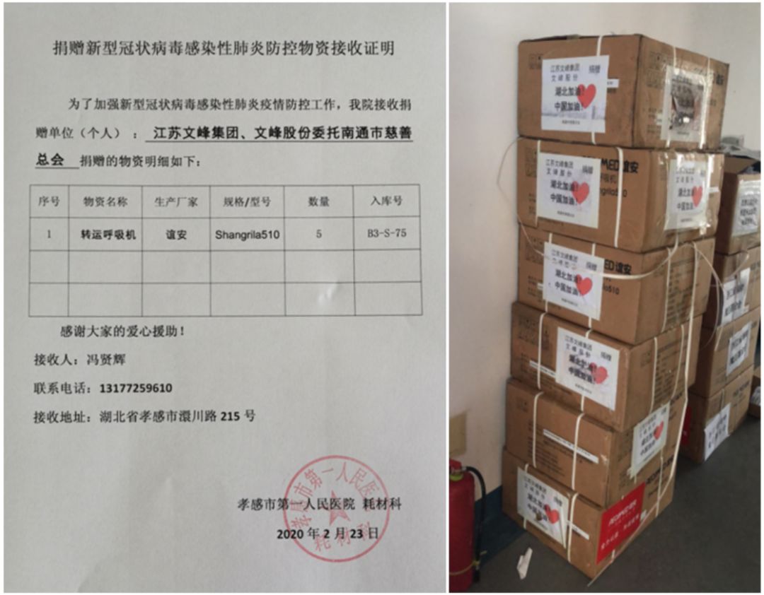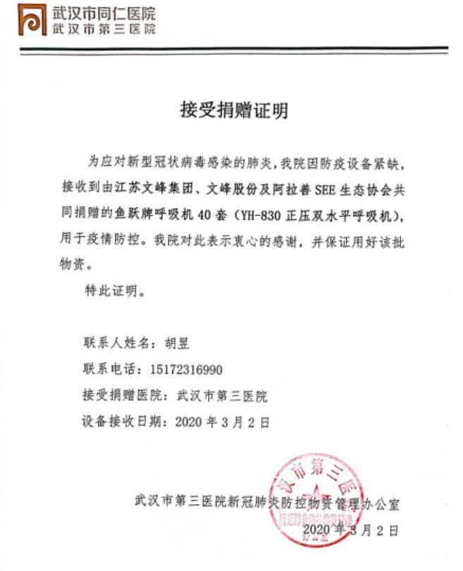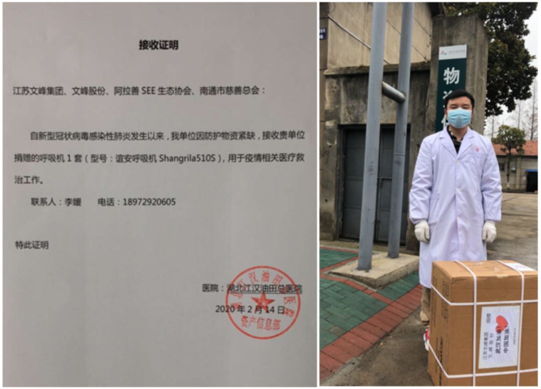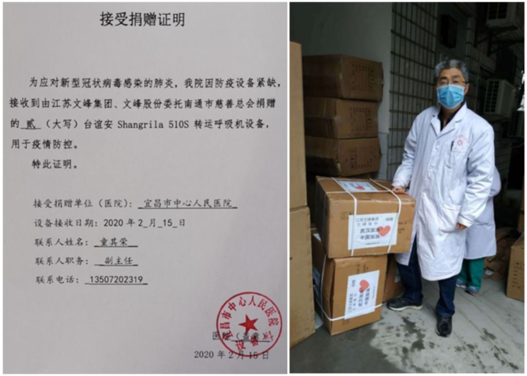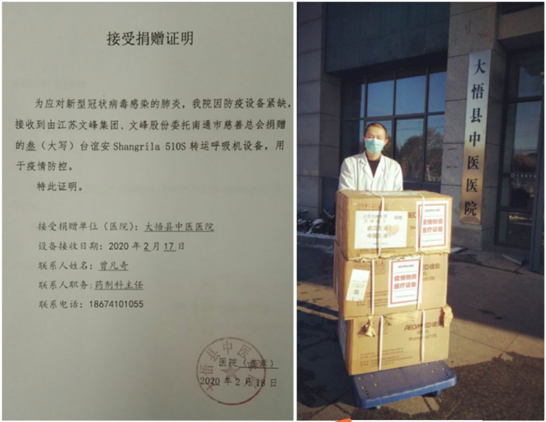 文峰集團攜手阿拉善SEE生態協會,共同捐助給武漢市第三醫院魚躍牌雙水平醫用專業呼吸機40臺,用于支援火神山醫院建設。