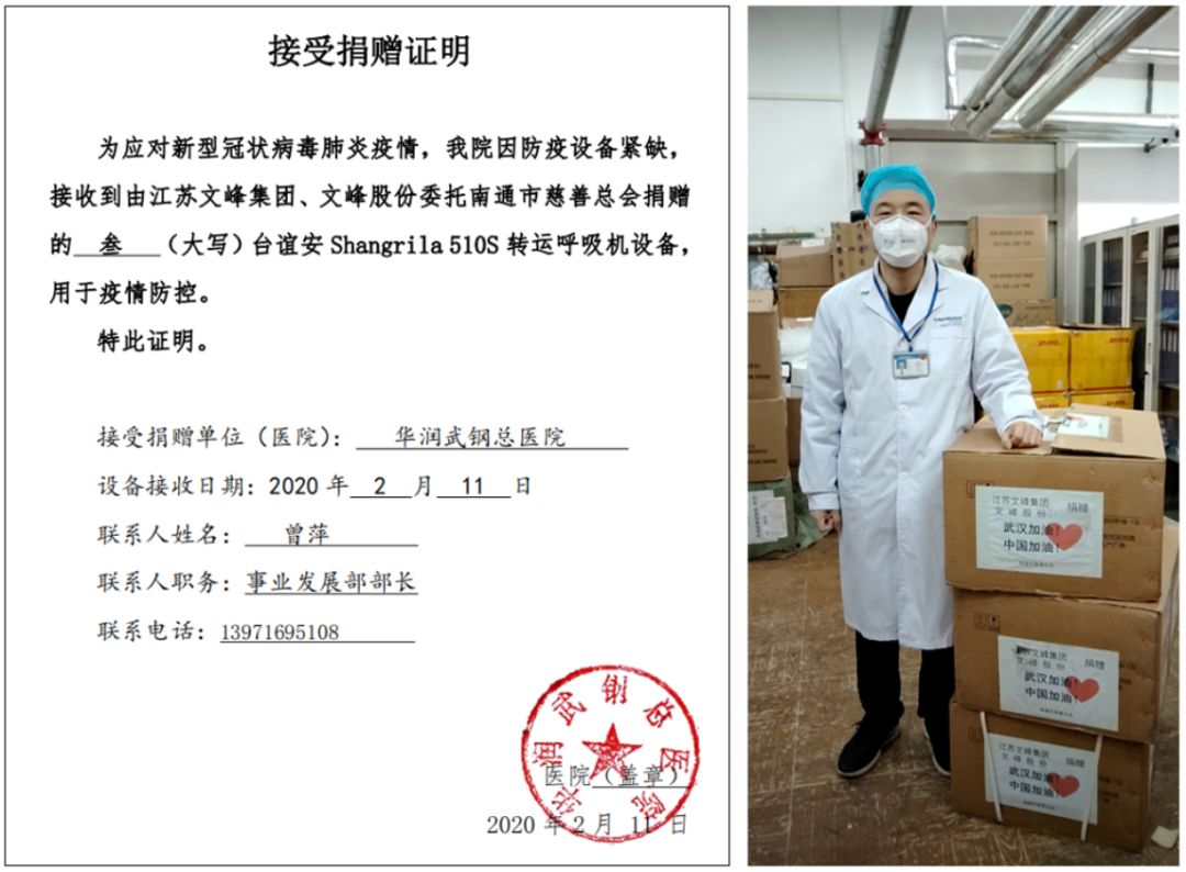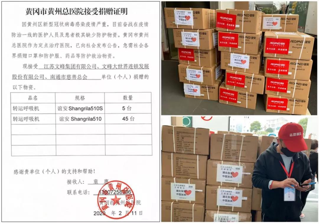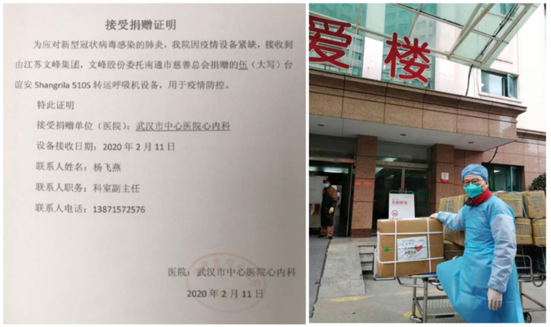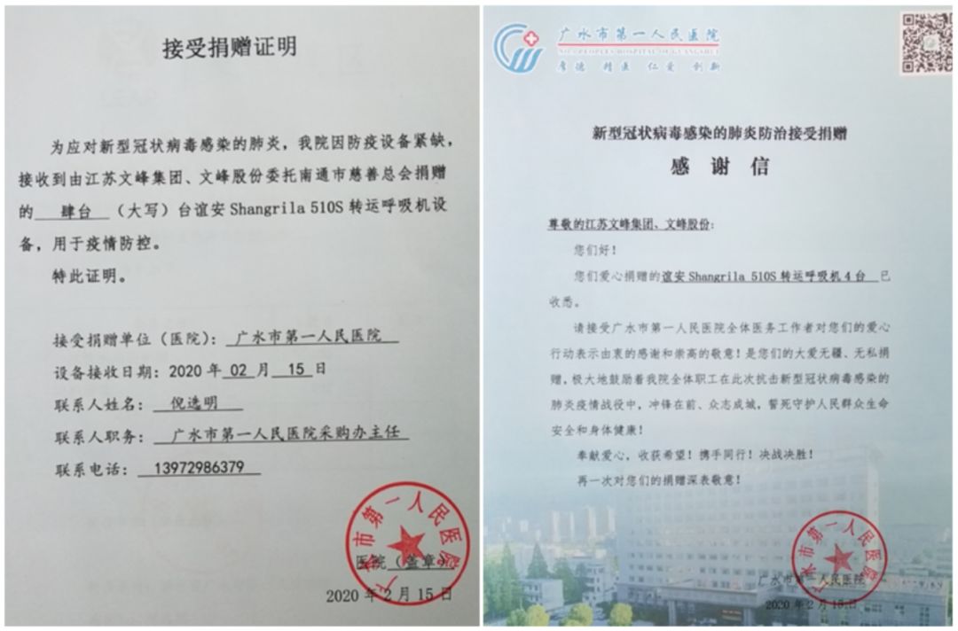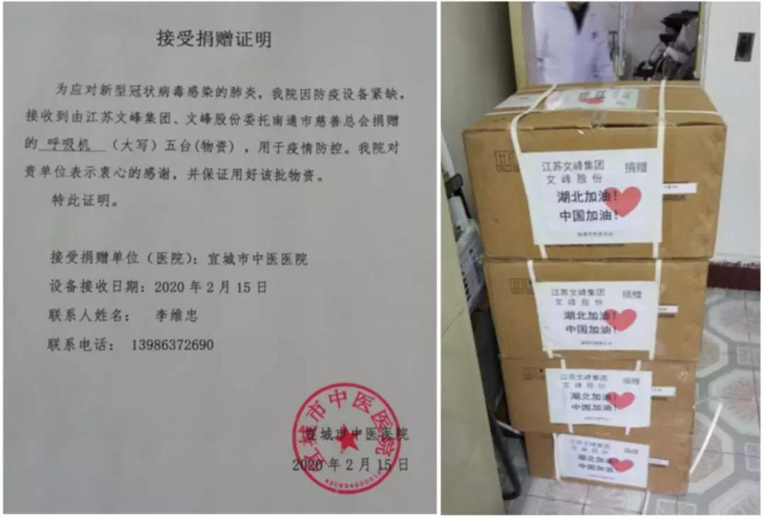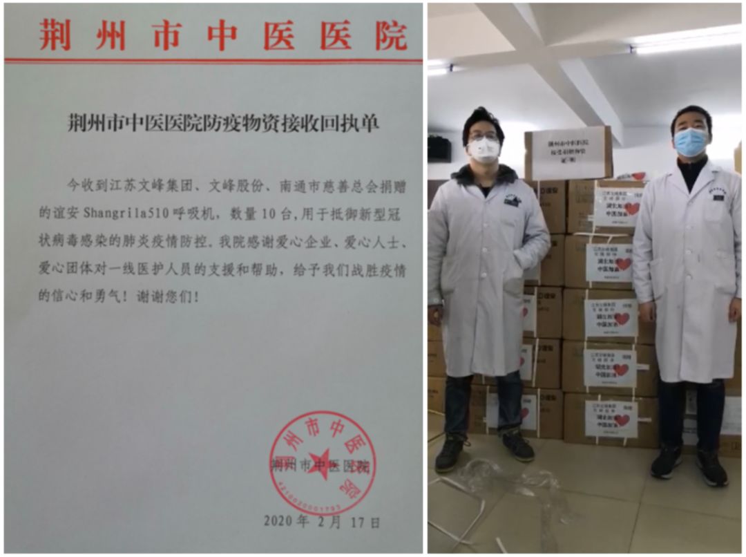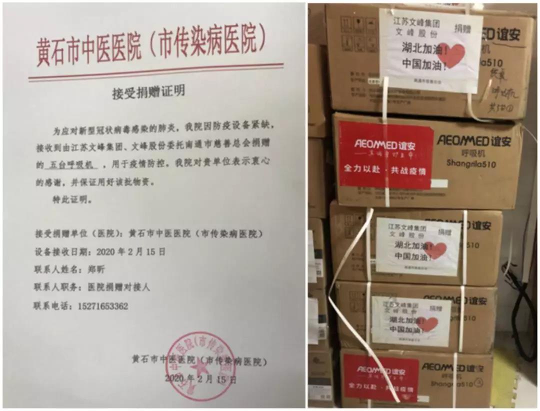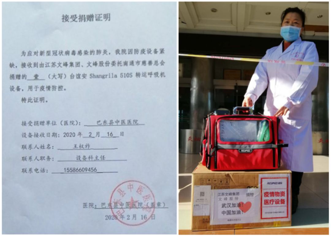 文峰集團攜手阿拉善SEE生態協會,共同捐助給武漢市第三醫院魚躍牌雙水平醫用專業呼吸機40臺,用于支援火神山醫院建設。
