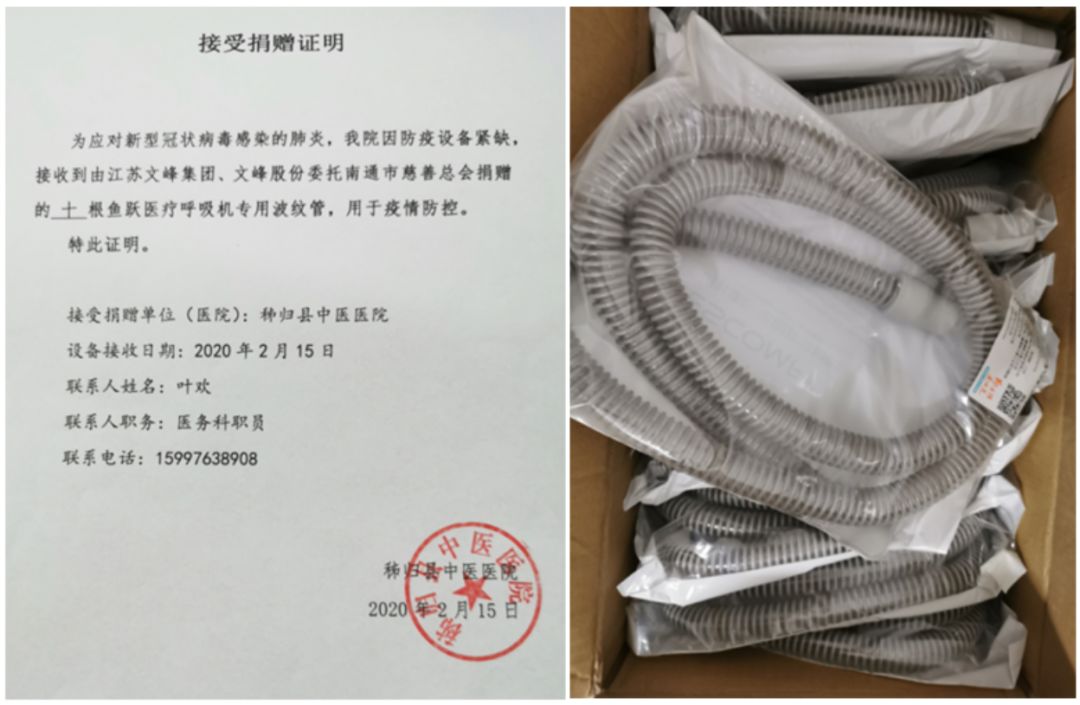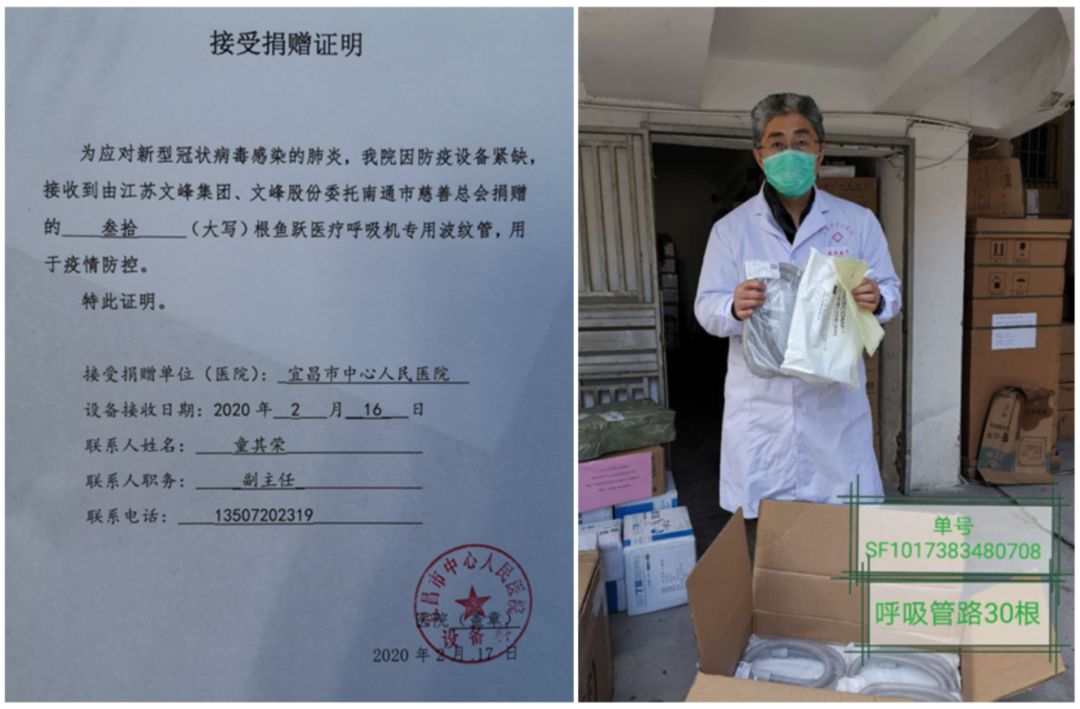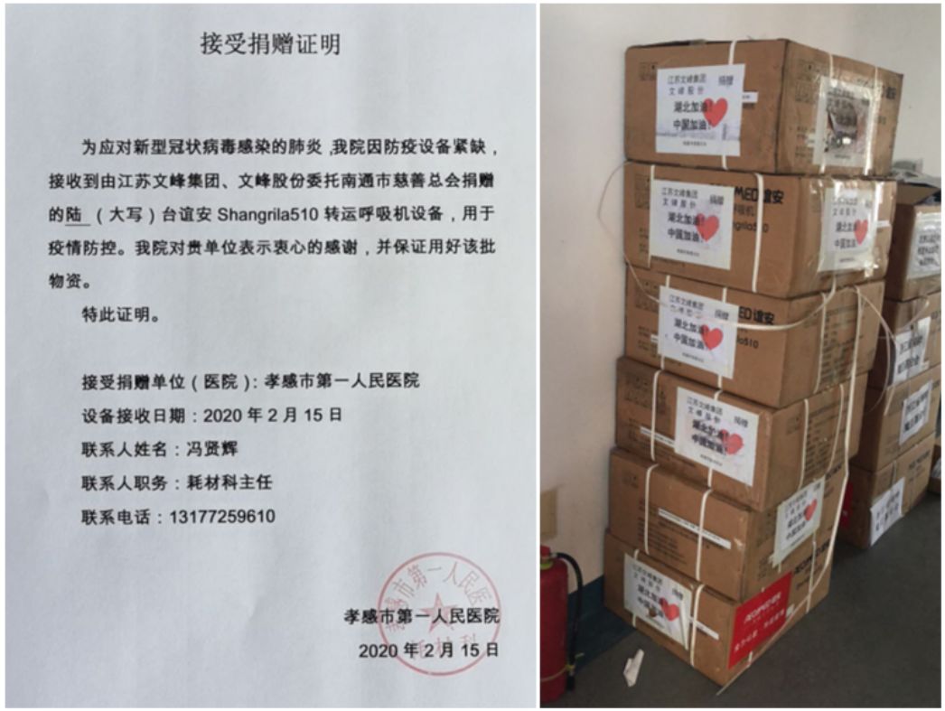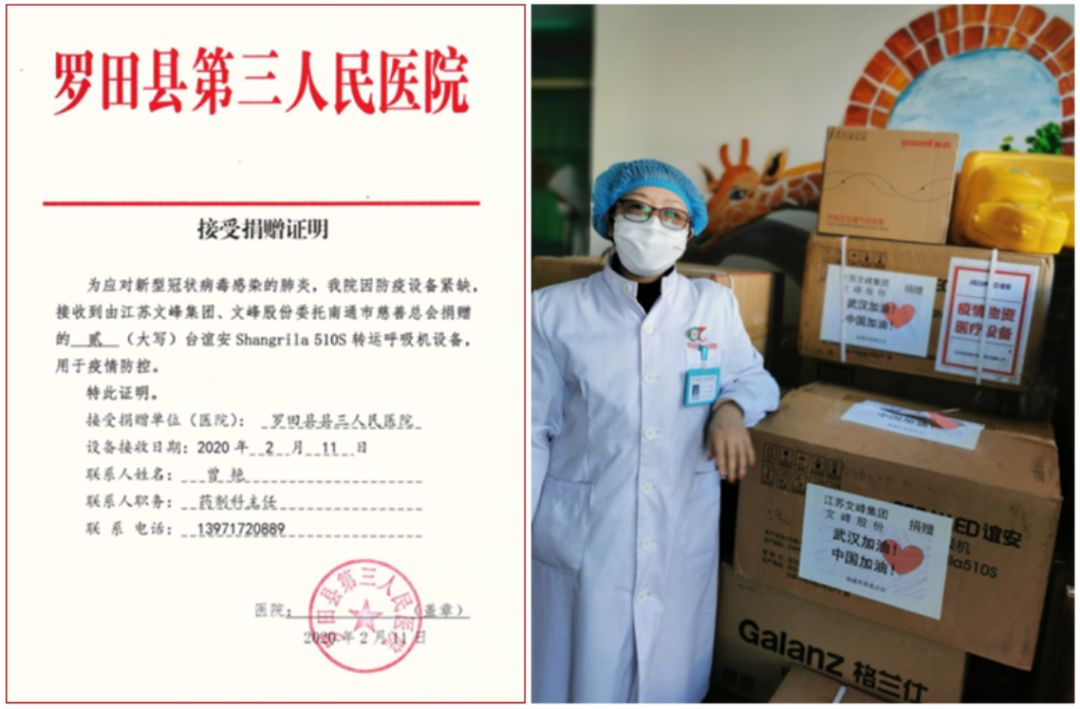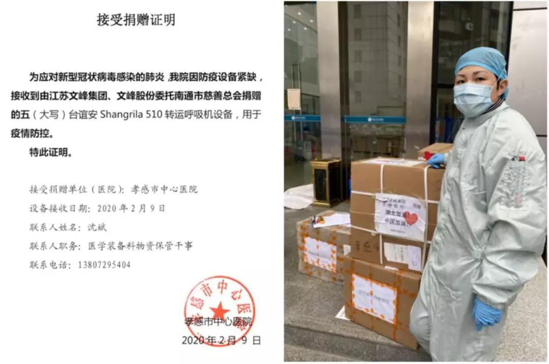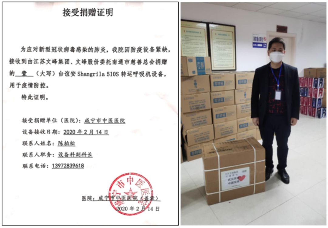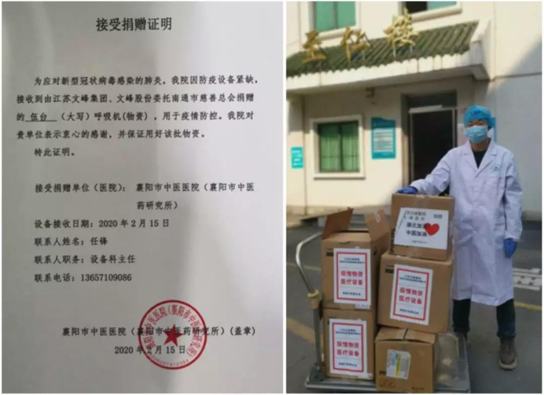 文峰集團攜手阿拉善SEE生態協會,共同捐助給武漢市第三醫院魚躍牌雙水平醫用專業呼吸機40臺,用于支援火神山醫院建設。