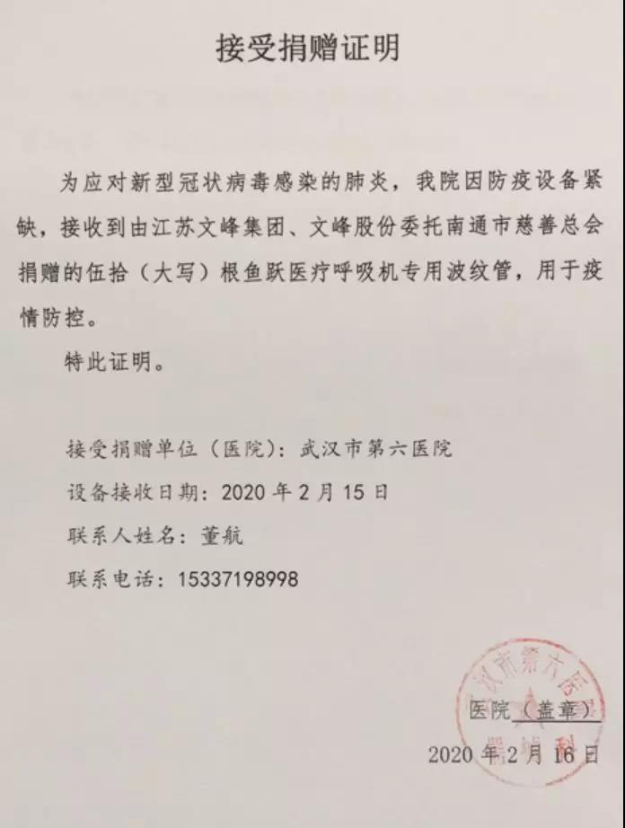 資金用途:江蘇文峰集團定向捐贈張家港市第六人民醫院,用于采購醫療設備、防疫物資