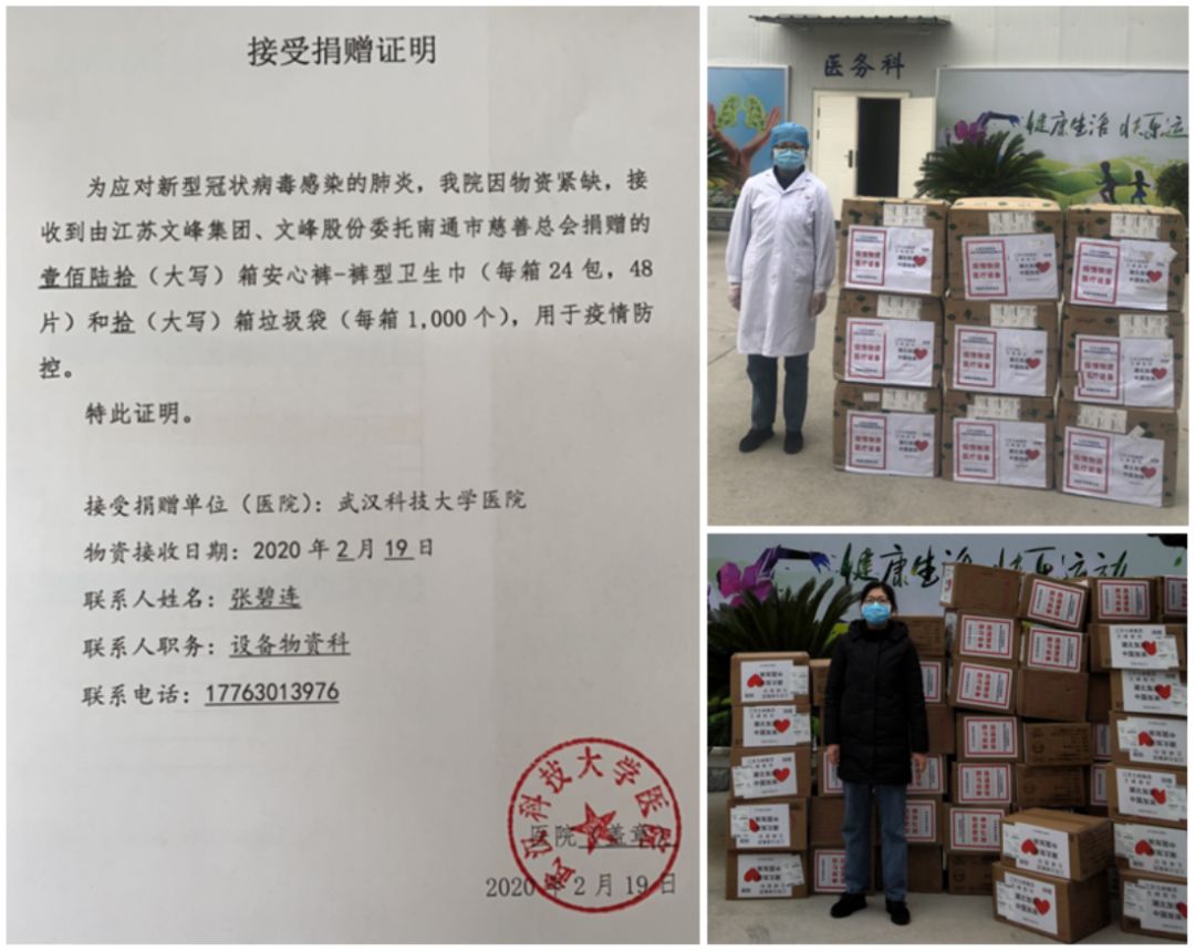 2月3日-2月28日,以南通市文峰慈善公益基金會的名義向南通大學附屬醫院、南通第三人民醫院提供后勤保障物資,包括千家惠食品、洗護用品、文峰飯店及南通大飯店半成品食材,共計約65萬元,以實際行動支持醫務工作者,解除他們生活上的后顧之憂。