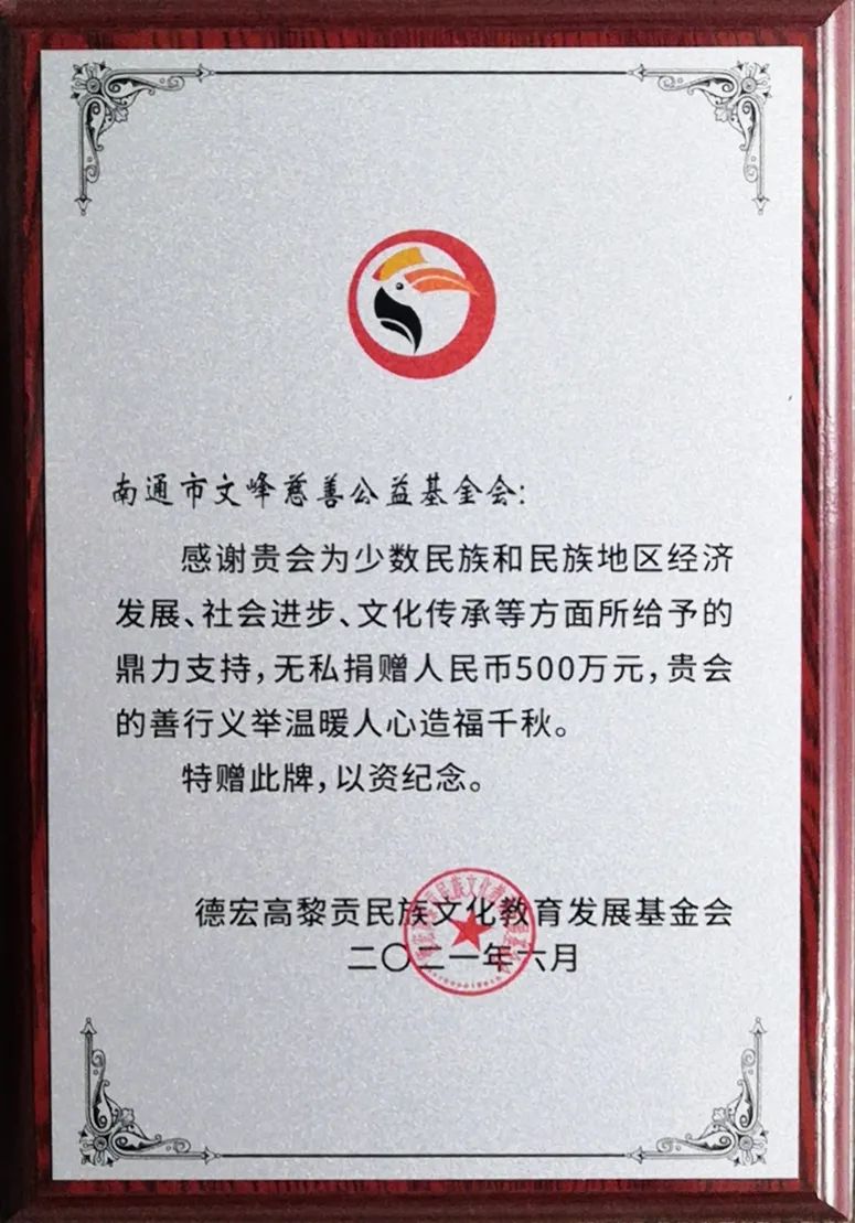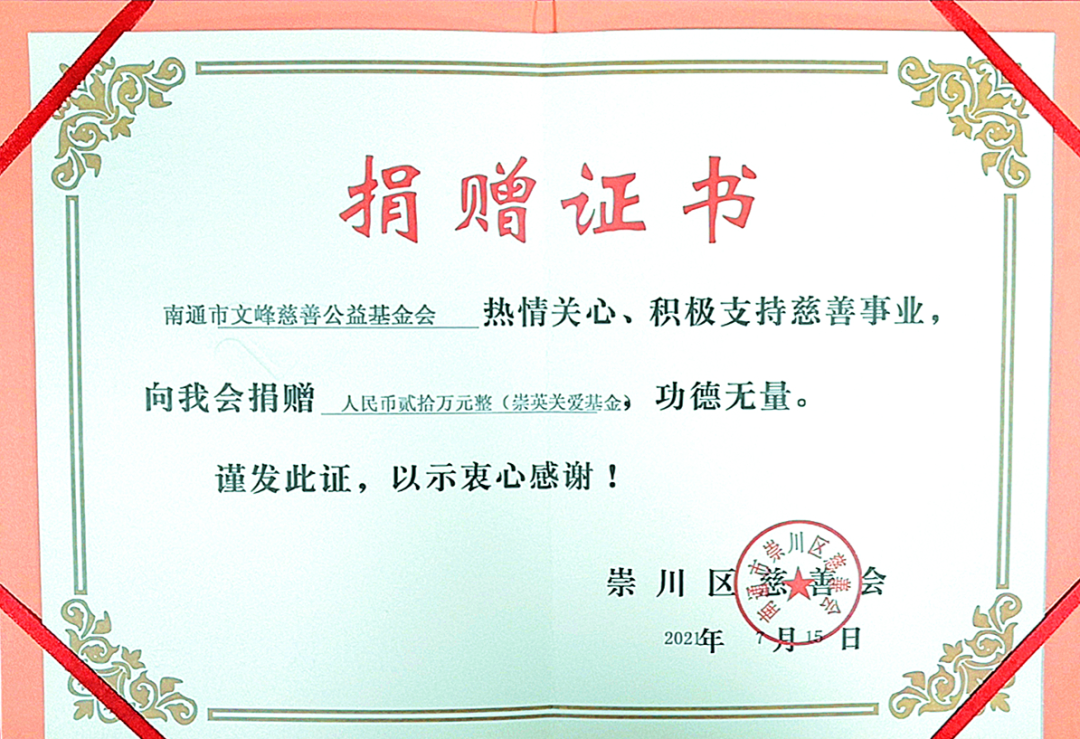 2021年9月,江蘇文峰集團榮獲“南通慈善獎”最具愛心捐贈企業(yè)稱號。