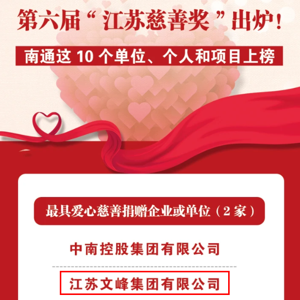 9月5日,江蘇省政府召開“江蘇慈善獎” 表彰大會,隆重表彰第六屆“江蘇慈善獎”獲獎單位和人員。江蘇文峰集團有限公司憑借長期以來在公益慈善領域的貢獻,被評為了“最具愛心慈善捐贈企業”。