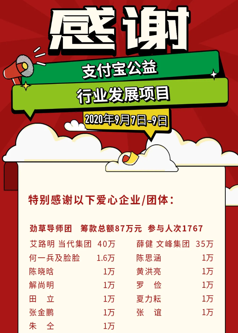 在阿拉善SEE公益機(jī)構(gòu)發(fā)布的「支付寶公益/行業(yè)發(fā)展項(xiàng)目」中,“勁草導(dǎo)師團(tuán)”共籌款87萬元,參與人次達(dá)到了1767次。其中,薛健籌款35萬元。