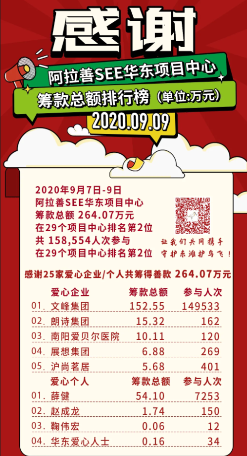 2020年“99公益日”剛剛落幕,三天時(shí)間(9月7日-9日),阿拉善SEE環(huán)保公益項(xiàng)目共獲得捐贈(zèng)2,119萬元,以及960,354人次的支持。