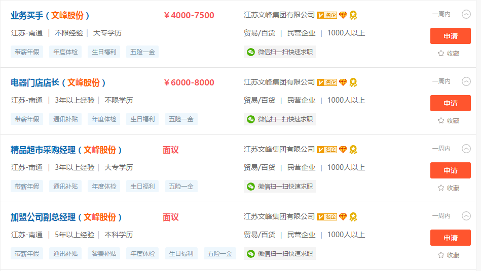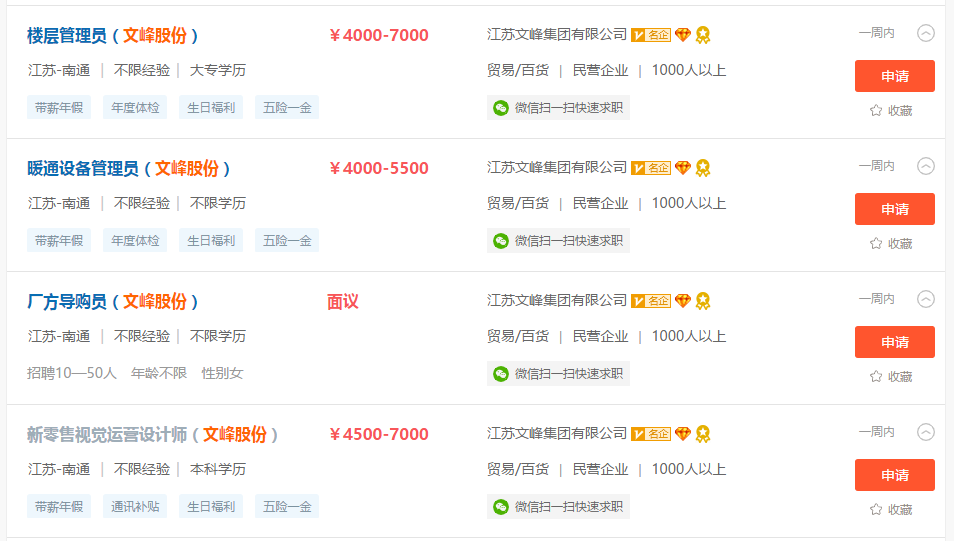 5月24日,阿拉善SEE生態(tài)協(xié)會正式開始號召會員參與支持全國工商聯(lián)“知名民企湖北行”活動,倡議會親企業(yè)群策群力為湖北復蘇凝聚力量。江蘇文峰集團積極響應,面向湖北提供14個工作職位,其中江蘇文峰集團有限公司2個職位,文峰股份9個職位,南通新有斐大酒店有限公司3個職位,總招聘人數(shù)達104人。