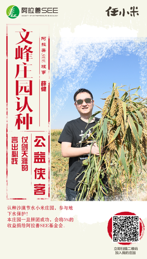 阿拉善,蒙語意為“五彩斑斕之地”,由于干旱少雨,荒漠化治理任重道遠(yuǎn)。為控制阿拉善地區(qū)沙漠蔓延,保護(hù)地下水資源,阿拉善SEE生態(tài)協(xié)會(huì)與內(nèi)蒙古阿拉善左旗政府合作,共同推動(dòng)節(jié)水小米的種植,這種沙漠小米被稱為“任小米”。