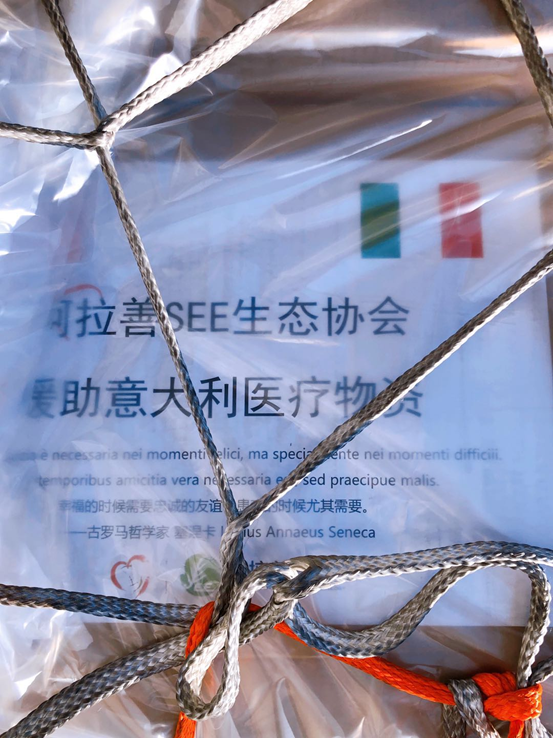“幸福的時候需要忠誠的友誼,患難的時刻尤其如此”,這句古羅馬哲學(xué)家塞涅卡的名言,也特意印制在了此次阿拉善SEE捐助意大利的醫(yī)療物資包裝上。值得一提的是,這名言的意大利語和拉丁語校對的志愿者Daniela,也來自意大利,是“阿拉善SEE志愿者”體系注冊的411號志愿者。